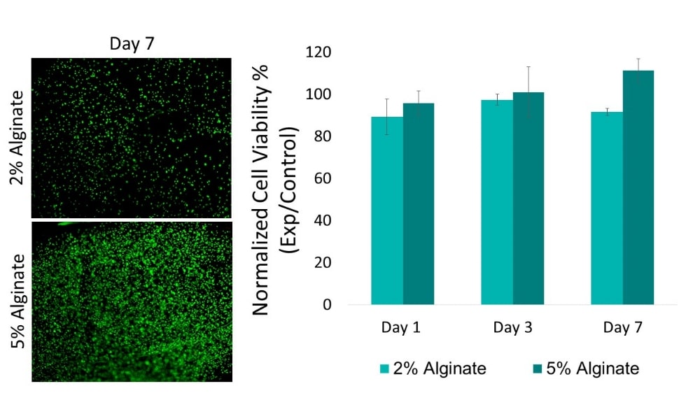 Before focusing on parameters in the 3D printing process that can affect viability, let’s start with parameters that affect viability in 3D cultures in general. You can test if these parameters are affecting your culture viability through an encapsulation study. We suggest completing an encapsulation study (or studies) to first characterize these parameters before advancing to bioprinted cultures, which will add more variables.